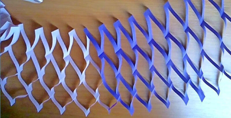 Заготовки склеиваем между собой или крепим при помощи степлера или скотча. Подвешиваем получившиеся новогодние гирлянды под потолок. Если сложить пополам лист бумаги по такой же системе можно смастерить вот эту гирлянду: