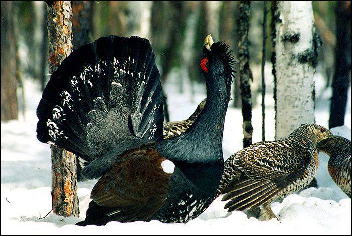 Глухарь - самый крупный представитель наших куриных птиц. Длина тела самца до 80-87 см, самки - около 60 см. Вес самца - 3-6 кг, самки до 2 кг. У самца голова и шея темно-серые с черными пестринами, зоб черный с зеленоватым отливом, грудь и горло черно-бурые, верх тела бурый, низ - белый или бурый, хвост черный, перья подбородка образуют бороду. Клюв у глухаря желто-розовый. Оперение самки светло-коричневое с белыми и рыжими пестринами. Обрез хвоста у глухарки закруглен, чем она отличается от тетерки. Молодые летом похожи на взрослую самку.