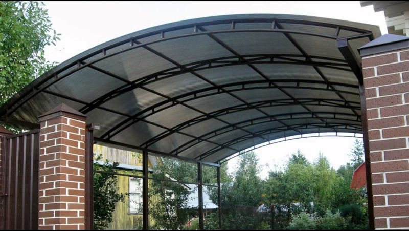 Навесы изготавливают, как уже упоминалось выше, из металлоконструкции. Металлический каркас служит в качестве основы для размещения крыши. Металлоконструкция удобна и надежна. Она имеет длительный срок службы и не требует специальной подготовки местности для монтажа. Саму же крышу изготавливают в различном исполнении. Она бывает односкатной и двускатной. Из поликарбоната, металлочерепицы, профнастила.